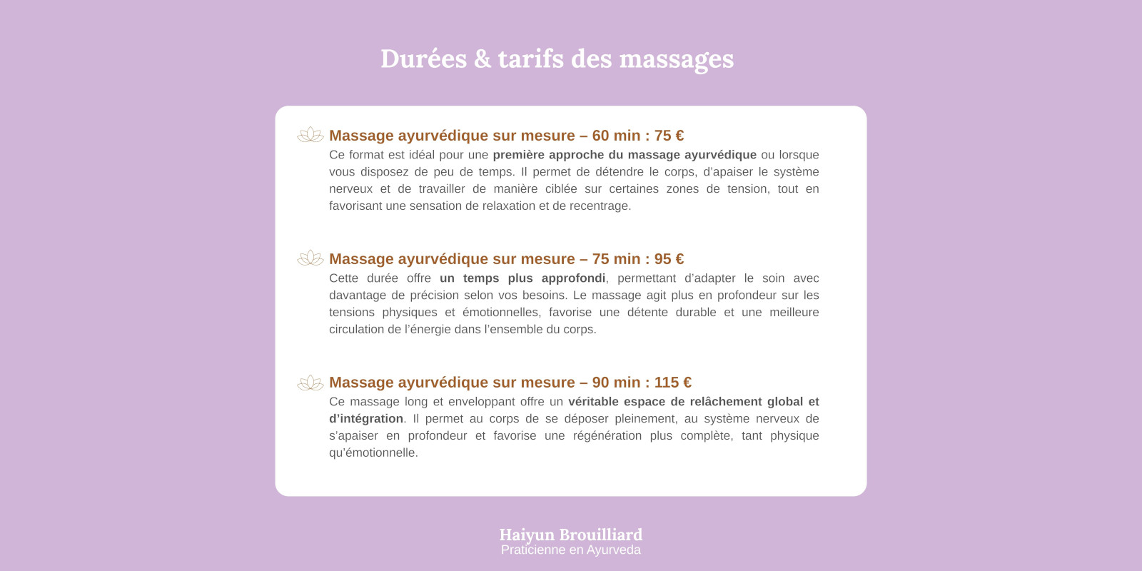 Le massage sur mesure que je propose est entièrement personnalisé, adapté à votre constitution, à votre état du moment et à vos besoins spécifiques.